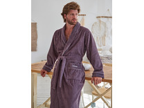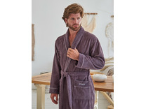 Классический халат с лаконичным дизайном.Фактурная ткань с ненавязчивым жаккардовым рисунком, отделка шальки, манжет и карманов кантом и тканью из равномерной махры, а так же брендовая надпись Vien на кармане.