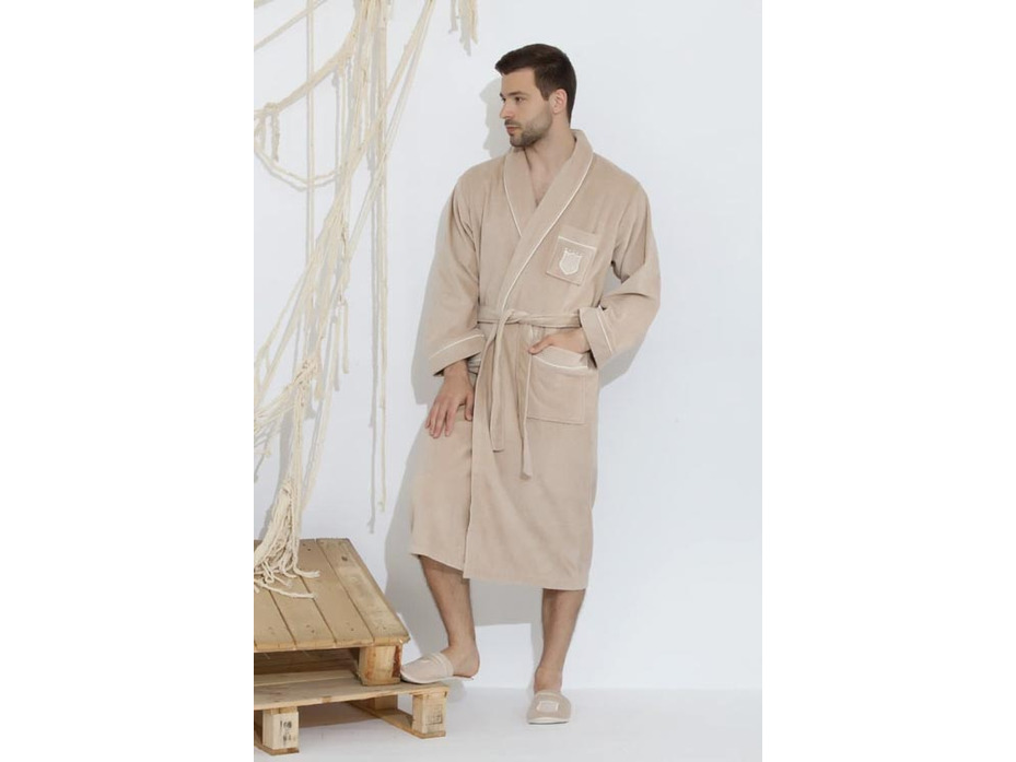 Классический мужской халат двухсторонний, с внешней стороны велюровый, что позволяет избежать затяжек, с внутренней махровый - создает легкий массажный эффект. Рукава выполнены с широкими манжетами, что позволяет с легкостью регулировать длину руки. Б...