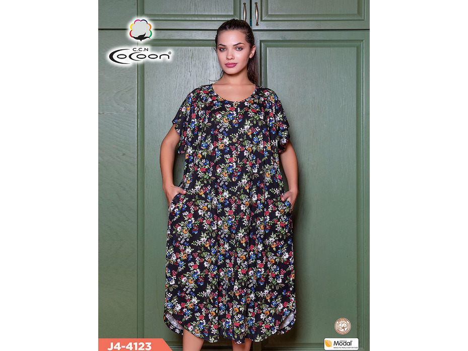 Женский халат с коротким рукавом, свободный крой. Застежка- пуговицы. Яркий цветочный принт.