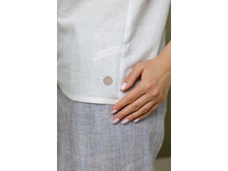 Женский костюм состоит из блузы и брюк. Блуза с коротким рукавом, легкая. Брюки с карманами по бокам прямые.