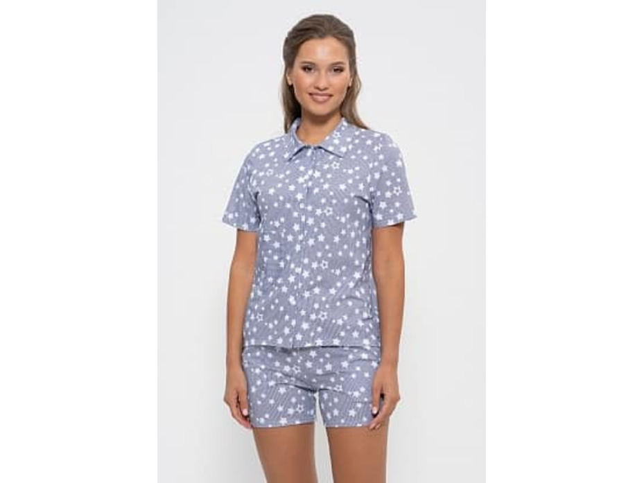 Уютная кокетливая женская пижама из хлопкового трикотажа. Рубашка полуприлегающего силуэта, с коротким рукавом, отложным воротником и центральной застёжкой на пуговицы. На правой полочке под грудью накладной карман. Низ рубашки фигурный, слегка удлинё...