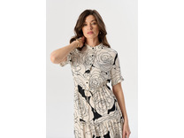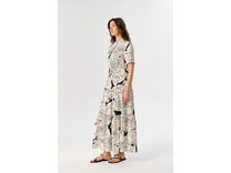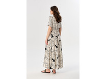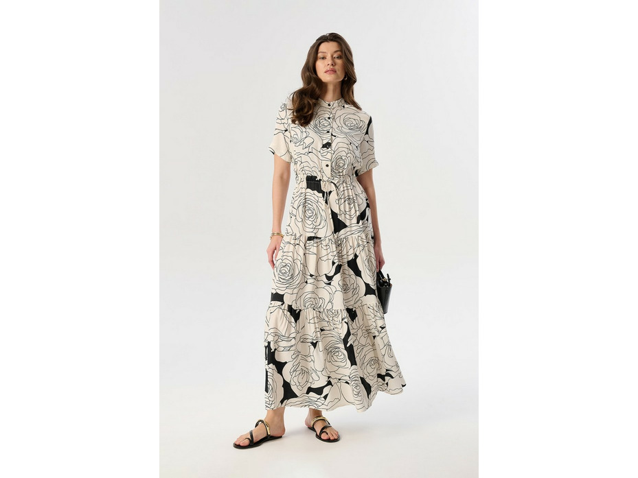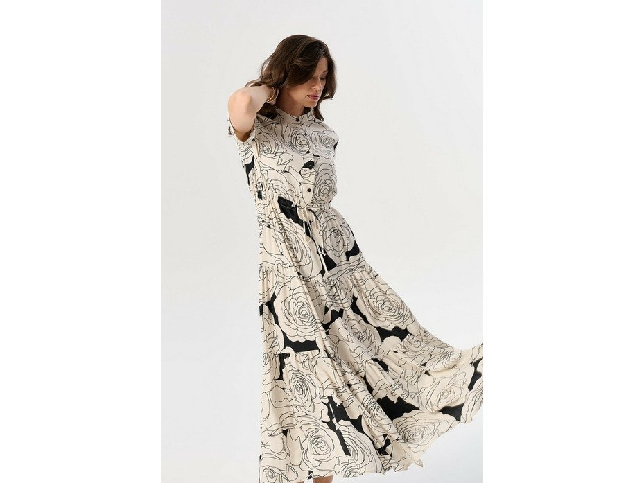 Платье-макси из струящейся вискозной ткани. Отрезное по талии. Юбка расклешённая, из трёх ярусов. Лиф с застёжкой на пуговицы и воротником-стойкой. Короткий рукав. По линии талии – кулиска со шнурком. Произведено в России.