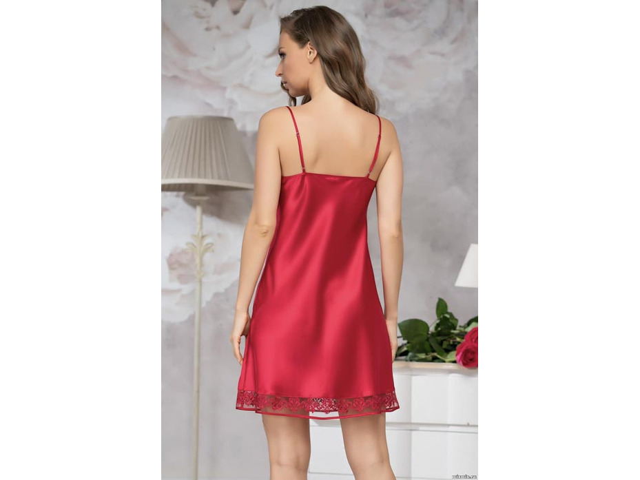 Короткая сорочка Mia-Amore на тонких бретелях без подреза под грудью, выполнена из однотонного искусственного шелка. Вырез и низ сорочки дополнены ажурной вышивкой на сетке. Декор - атласный бантик с подвеской по центру выреза.