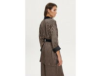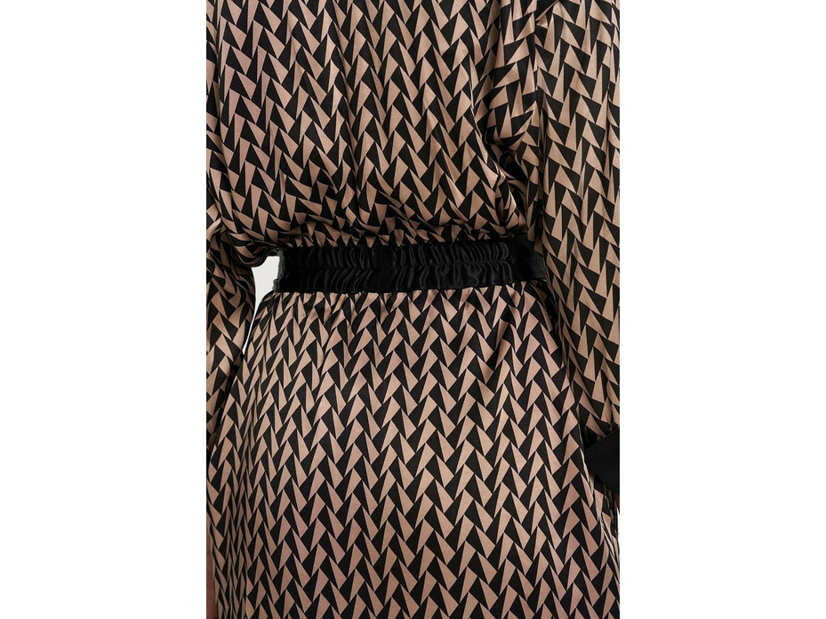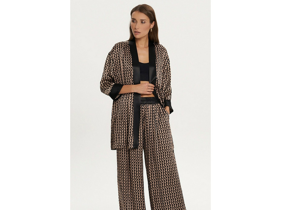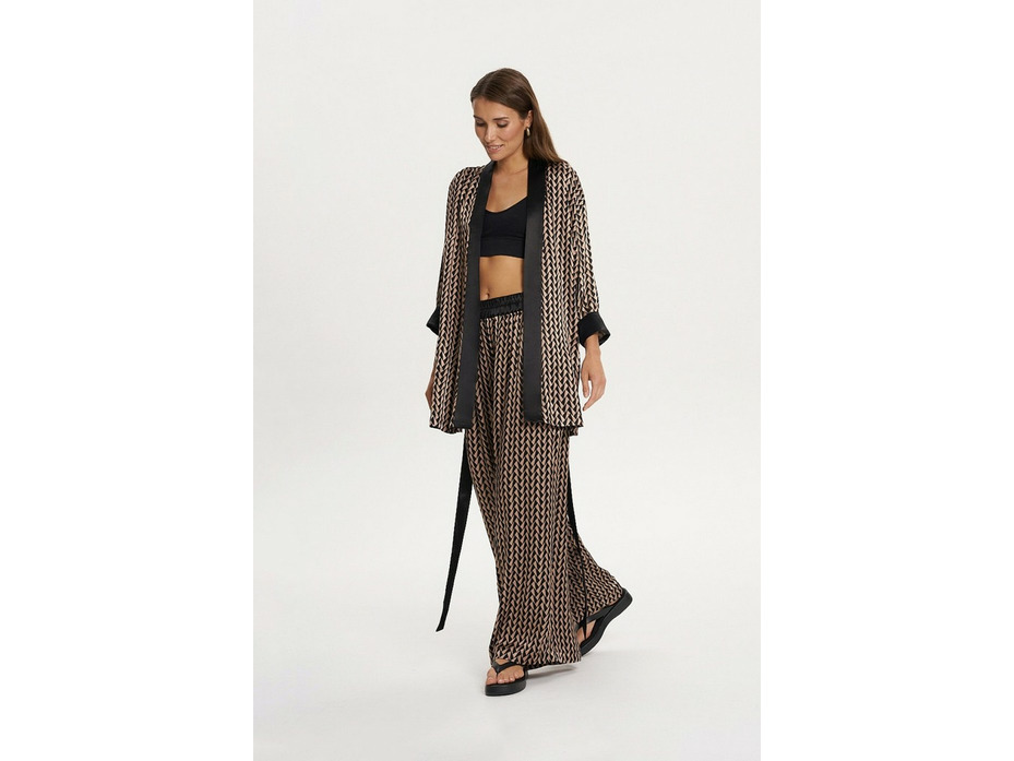 Кимоно из вискозной ткани с отделкой контрастного цвета. Свободный, чуть расклешённый силуэт. Спущенная линия плеча, рукава ¾ с манжетами. В боковых швах – карманы и разрезы. Средний участок пояса настрочен на спинку и посажен на резинку.